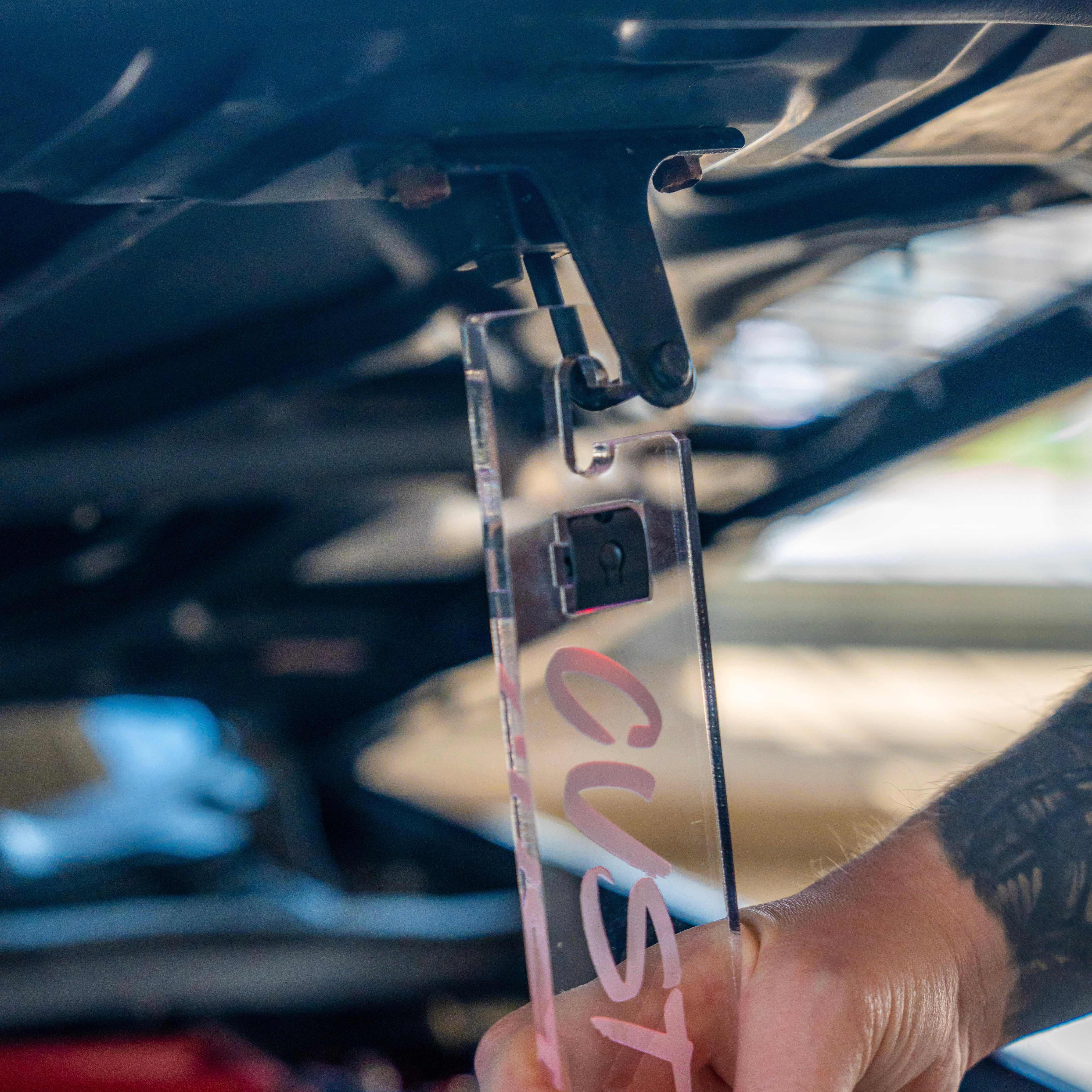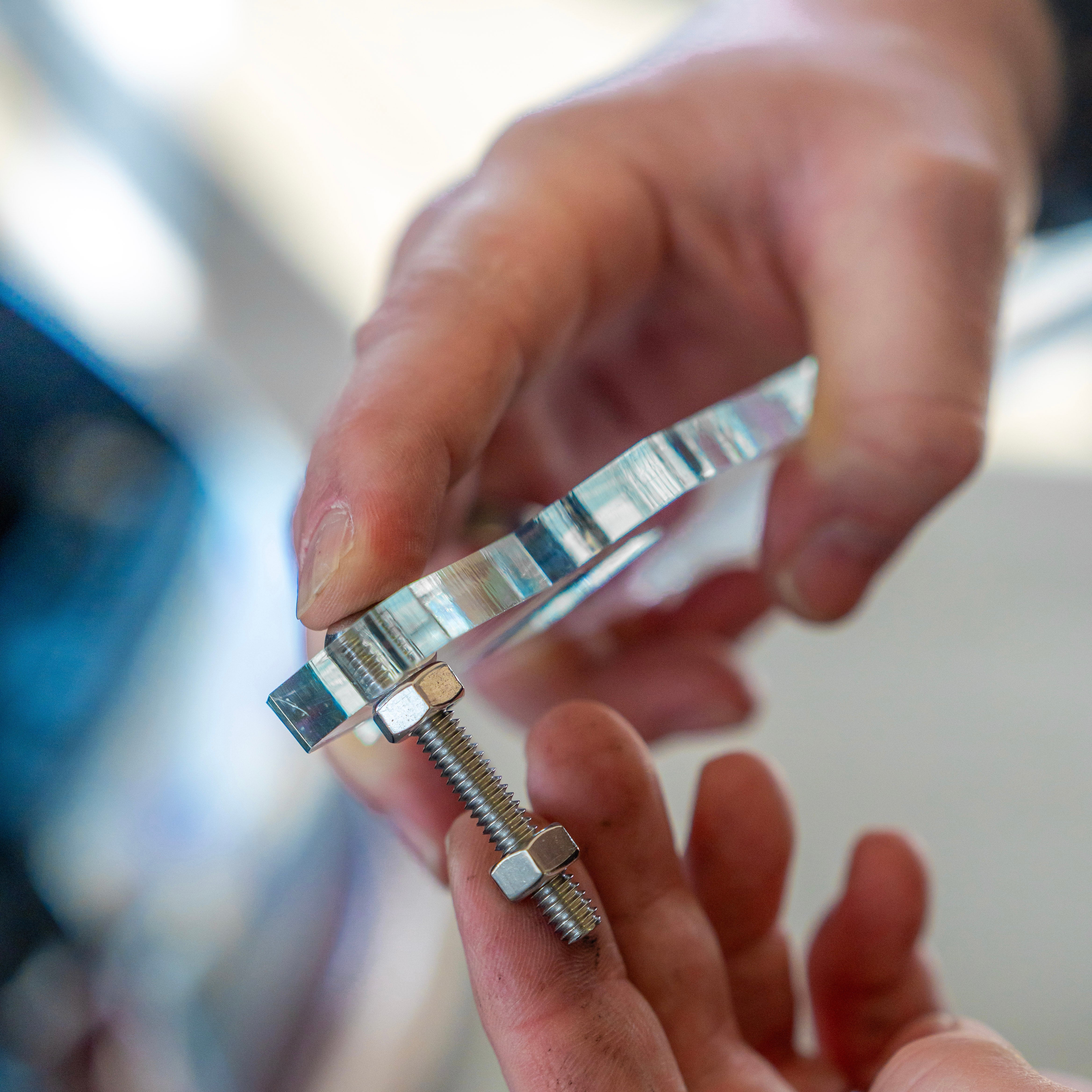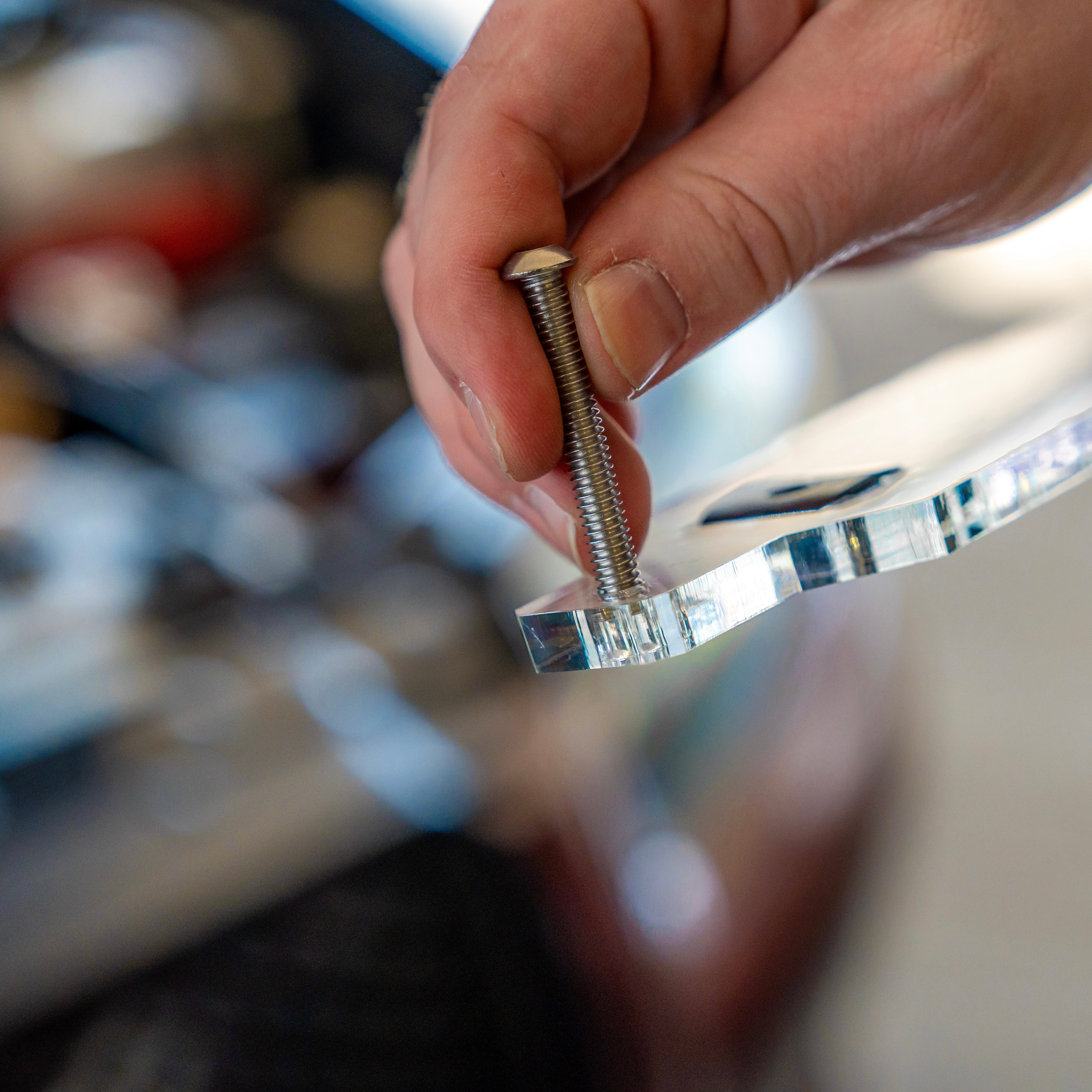 ONCE THE BOLT IS FULLY INSERTED, THREAD ONE NUT ALL THE WAY TO THE ACRYLIC, DO NOT OVERTIGHTEN. THEN INSTALL THE SECONDARY NUT APPROXIMATELY 1/2" ONTO THE BOLT. PICTURE IS FOR REFERENCE , ADJUST AS NEEDED.