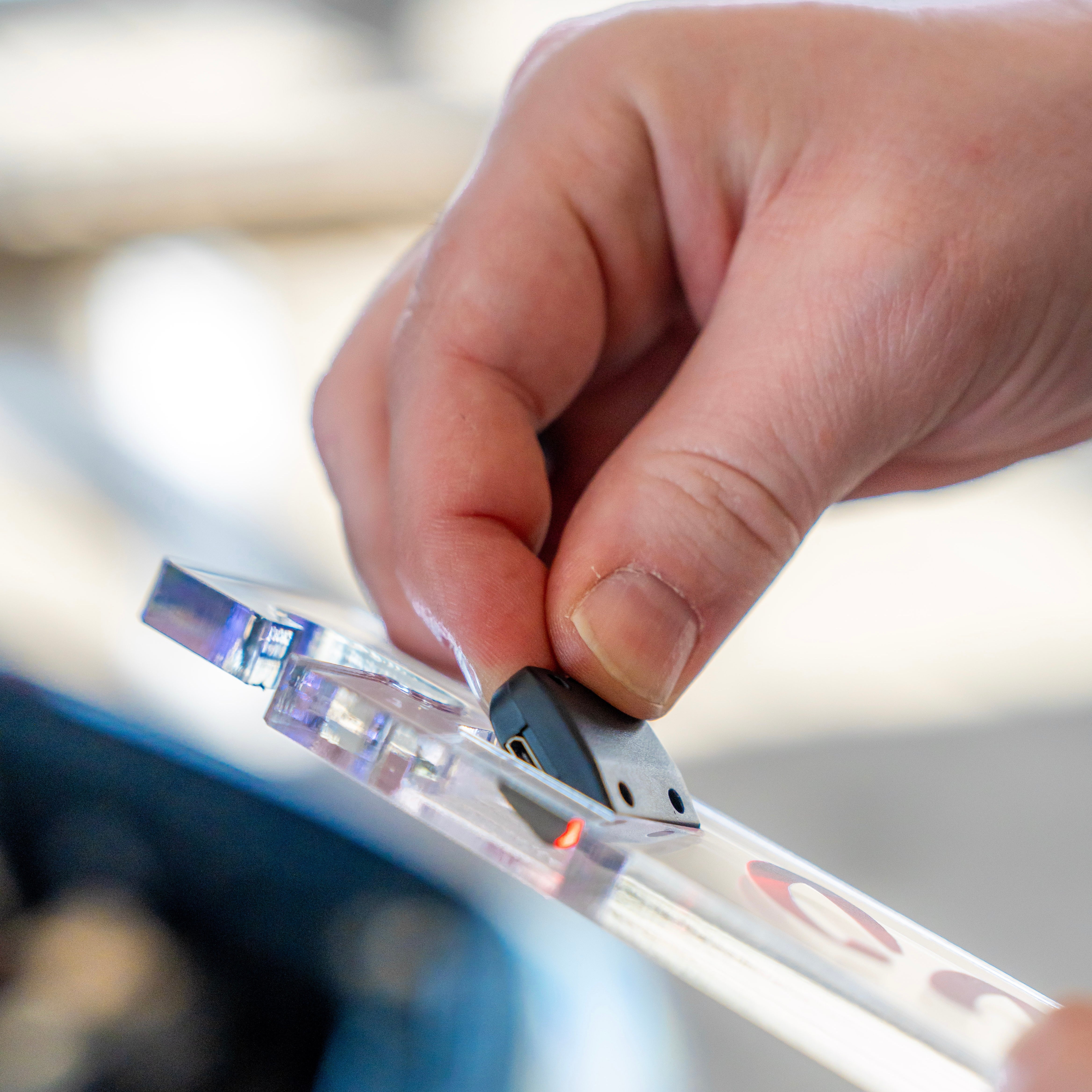GENTLY SQUEEZE THE TOP AND BOTTOM OF THE LIGHT UNTIL IT SITS FLUSH WITHIN THE SQUARE HOLE ON YOUR PROP, LIKE SHOWN IN PICTURE.
