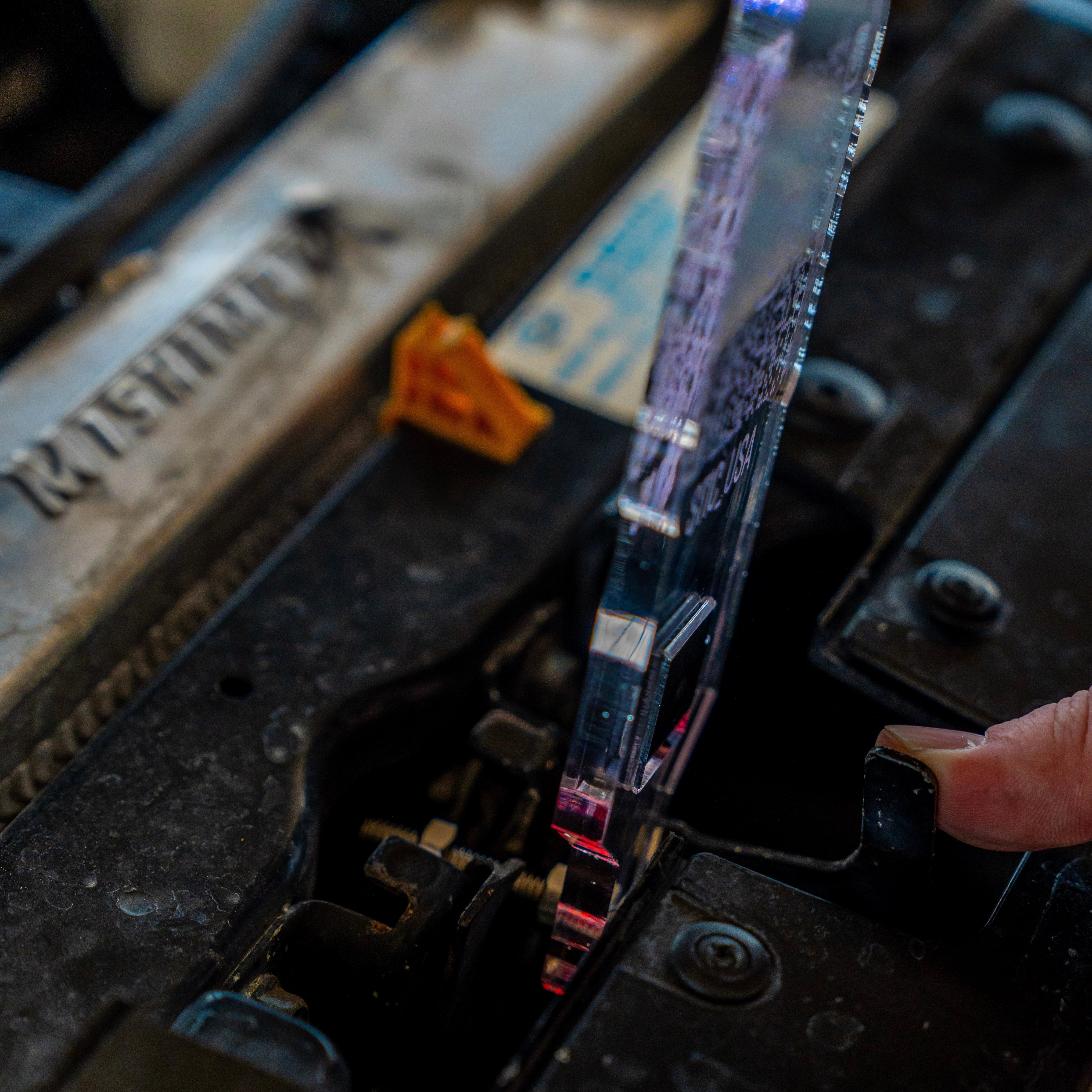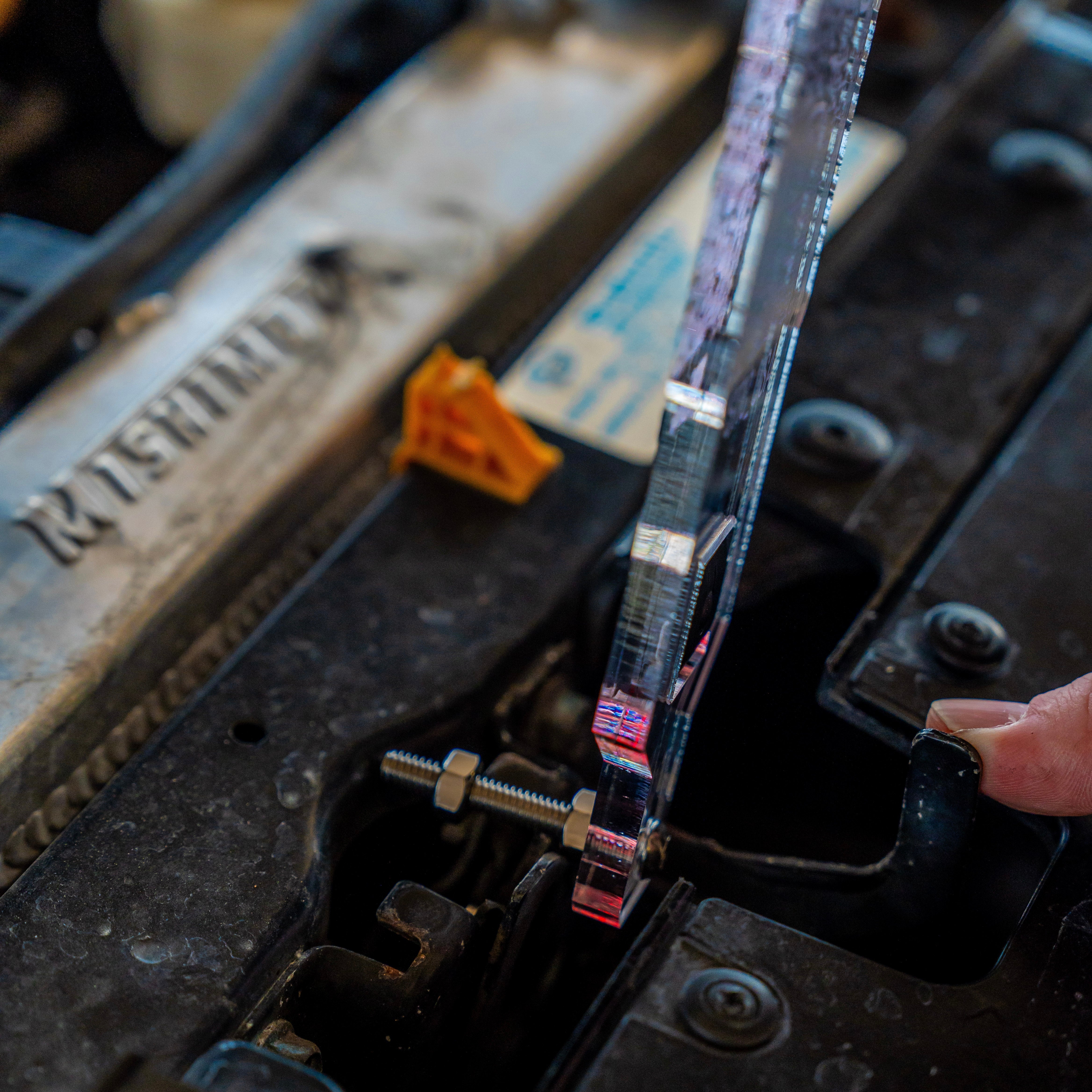 MANUALLY MOVE THE HOOD SAFETY LATCH LEVER AND REST THE BOLT INSIDE THE EXPOSED MECHANISM, THEN RELEASE THE LATCH. NEVER APPLY PRESSURE TO THE BOLT WHILE IT IS INSTALLED IN THE PROP, AS THE LEVERAGE AND FORCE COULD BREAK THE BOTTOM OF YOUR PROP.